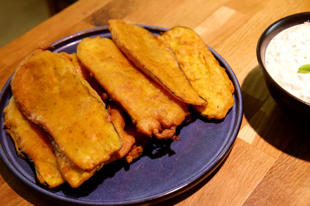 Beguni is an eggplant dish from the Bengal region of India. The eggplants are breaded in chickpea batter and deep-fried and eaten either hot or cold.