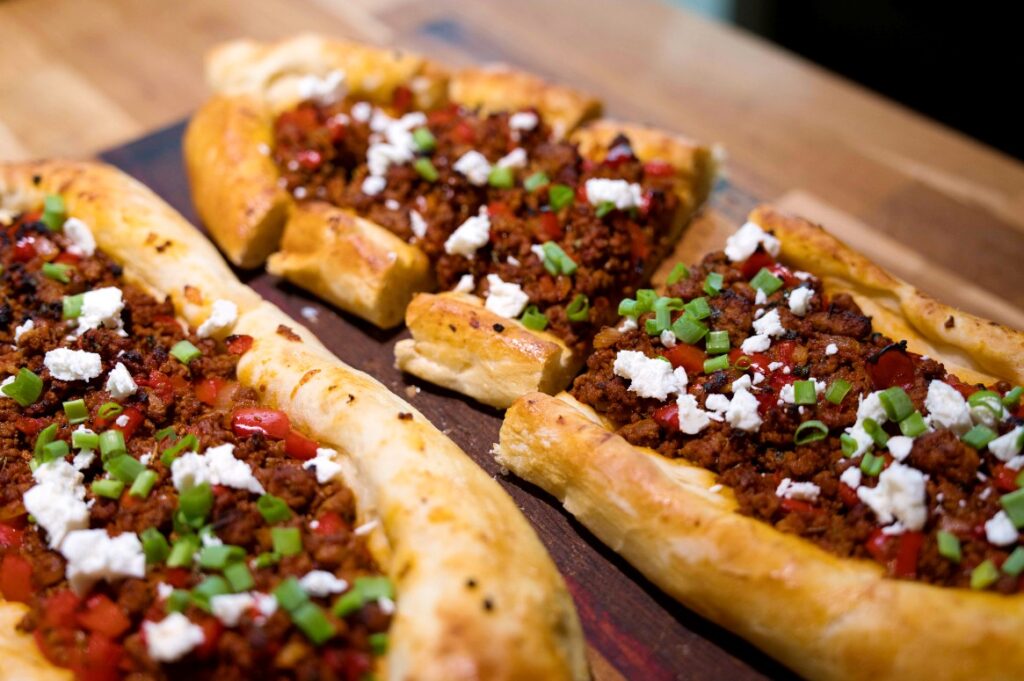 - After removing from the oven, let the pides cool slightly, crumble the goat cheese or feta cheese, and sprinkle it over the pides. Sprinkle with chopped green onions. Cut the pides crosswise with a sharp knife into pieces about 5-7 cm wide and serve.