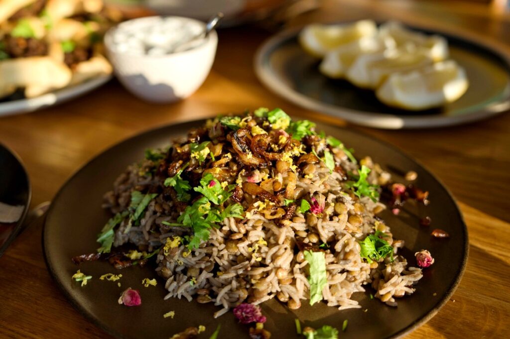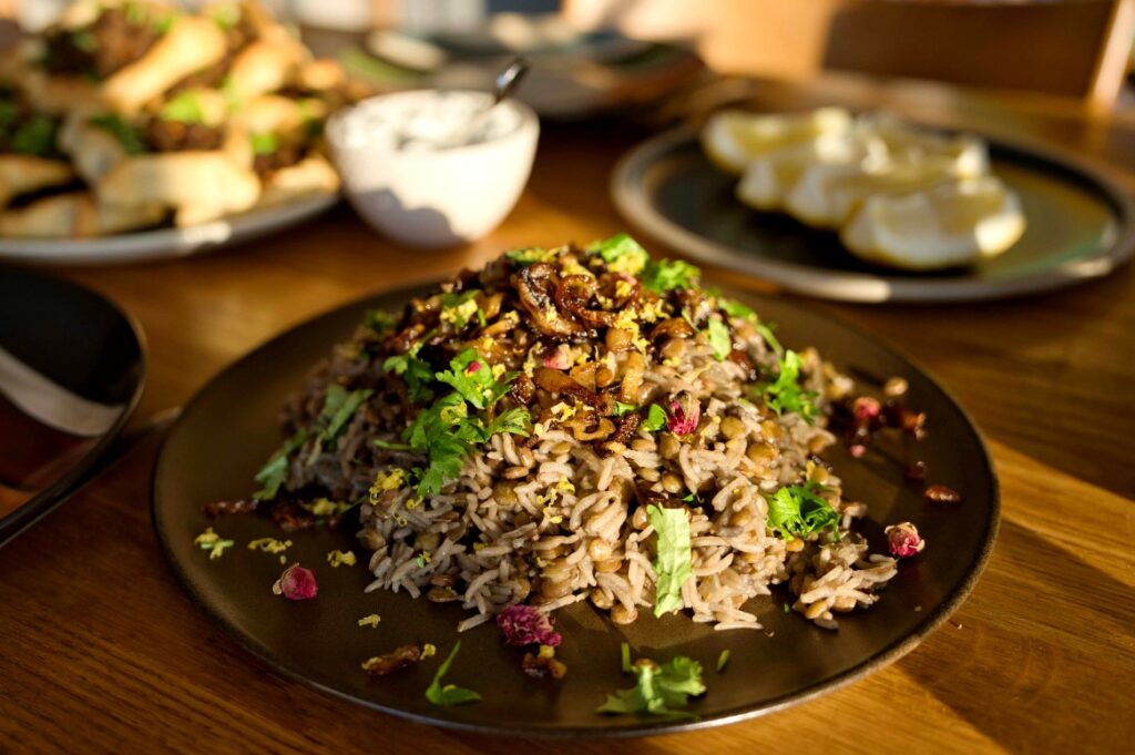A delicious rice and lentil dish common in the Levantine food region. This dish is made with either green or brown lentils, which are mixed with rice during cooking. The rice is often either whole-grain rice, basmati, or long-grain rice. The timing of adding the rice to the dish also varies accordingly. The rice variety that takes the longest to cook is added to the dish the earliest.