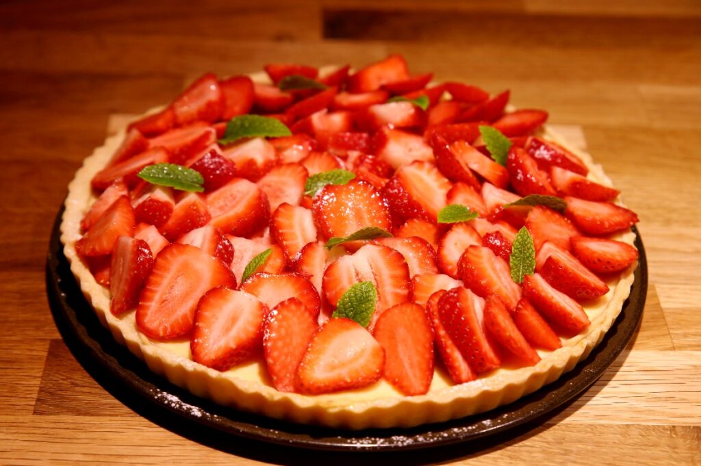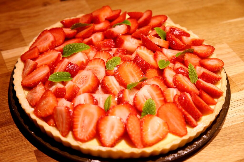 In the summer, you have to make at least one pastry with strawberries. I combined lemon shortcrust pastry, cream cheese, and strawberries and made this cake. I made an exception and tried this cake myself, but only because of the wonderful company I had while eating it. Also, a minor observation. This cake is especially delicious when fresh peppermint leaves are eaten with it, rather than just taken as part of the garnish.
